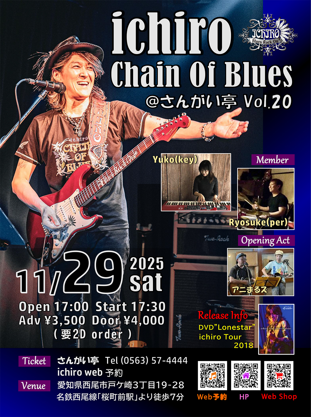 2025.11.29 ichiro”Chain Of Blues″ @ さんがい亭 Vol.2011/29(Sat) @ 西尾 さんがい亭Support Member – Yuko (Key) / Ryosuke (Pe […]